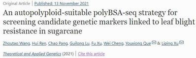 2021年11月13日,植物遗传育种领域国际知名学术期刊《理论与应用遗传学》(Theoretical and Applied Genetics)在线发表了公司许莉萍和阙友雄团队题为“An autopolyploid-suitable polyBSA-seq strategy for screening candidate genetic markers linked to leaf blight resistance in sugarcane”的研究论文。该研究首次从甘蔗遗传图谱QTL定位的策略中汲取灵感,利用单剂量多态性标记,优化完善了传统的BSA-seq方法,所建立的方法称为polyBSA-seq。进一步,采用所建立的polyBSA-seq技术,筛选并获得甘蔗中与叶枯病抗性基因紧密连锁的4个分子标记,有望应用于甘蔗抗叶枯病性的鉴定及其遗传育种领域。研究证明,与传统的遗传谱图或GWAS定位法相比,作者所建立的polyBSA-seq方法,能够简便快捷地应用于同源多倍体物种中重要目标性状连锁标记的筛选,该研究将有助于推进甘蔗重要目标性状连锁标记的筛选及分子育种研究的进程。