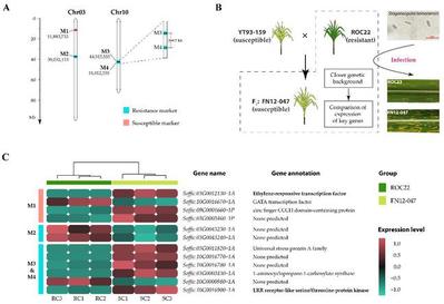 经过筛选,该研究共获得了4个与甘蔗叶枯病抗性相关的连锁标记,包含3个抗病性关联标记和1个感病性关联标记(图2A)。进一步,作者比较了抗病亲本ROC22和感病子代FN12-047的转录表达谱,筛选得到12个在4个标记1.0 Mb内差异表达的基因(图2B,2C)。这些基因预测与甘蔗叶枯病抗性密切相关,有望作为叶枯病抗性遗传改良的重要候选靶标基因。