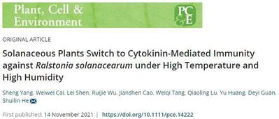 在热带和亚热带地区,高温高湿是植物频繁遭遇的自然环境。高温高湿下对病原菌侵染的敏感构成了多数喜温作物抗病的瓶颈。虽然高温对植物抗病的影响近年来逐渐得到了重视,但大多数研究仅止于高温对植物免疫的阻止作用。该研究第一次将CK信号通路与高温高湿下茄科植物抗病联系起来,开辟了植物抗病机制研究新领域;青枯病等土传病原菌寄主十分广泛,它们蛰伏在土壤中只要遇到高温高湿的环境即可危害植物,且一旦发病防治十分困难。这可能与基于传统常温下抗病机制的防治策略不当有关。该研究发现的通过调节CK信号通路可有效提高茄科植物在高温高湿下的抗病水平,为此类病害的防治开辟了新的途径。