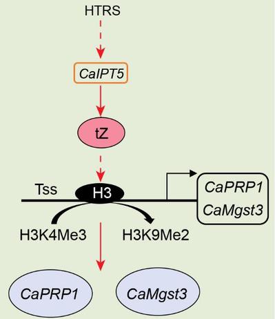 公司何水林教授团队于Plant, Cell & Environment在线发表了题为“Solanaceous Plants Switch to Cytokinin-Mediated Immunity against Ralstonia solanacearum under High Temperature and High Humidity” 的研究论文指出辣椒等茄科植物在常温下启动SA和JA通路介导的免疫反应以应答青枯菌的侵染,然而,在高温高湿条件下,SA信号通路仅在青枯菌侵染的早期有短暂的上调,JA介导的信号通路则被关闭,而CK信号通路被激活,并因此激活高温高湿下特异的GST以提高植物的抗病水平。该研究首先通过RNA-seq和内源激素检测发现高温高湿下青枯菌接种后Mgst3和PRP1等编码GST蛋白的基因和CK合成的关键酶基因IPT5显著上调,ICS1和LOX1等合成SA和JA的关键酶基因下调,与之相应的是JA的含量降低和SA的含量提早降低;相反,反玉米素等CKs的含量则显著上调。研究进一步通过反向遗传学手段发现IPT5、Mgst3和PRP1在高温高湿下辣椒和本生烟草抗青枯病中起正调节作用,且IPT5的表达上调可导致Mgst3和PRP1等表达上调。说明CK信号通过控制GST编码基因的表达起作用。研究进一步发现CK通路介导的免疫反应仅存在于应答病原菌侵染中,它可增加H3K9me2而降低H3K4me3在Mgst3和PRP1等抗病相关基因的转录起始位点附近沉积,从而调节染色质重塑。此外,还发现外源施加的SA、MeJA和反玉米素中仅反玉米素可提高辣椒、番茄和烟草在高温高湿下抗青枯病水平,进一步证实了细胞分裂素在这些茄科植物高温高湿下抗青枯病的作用。